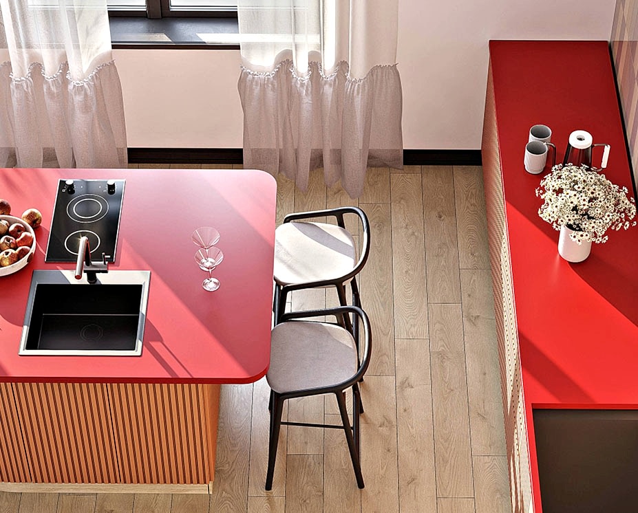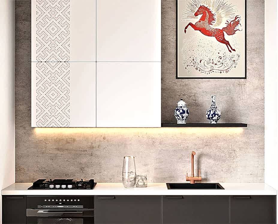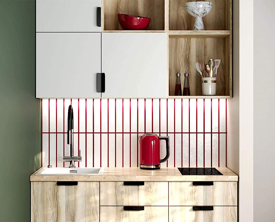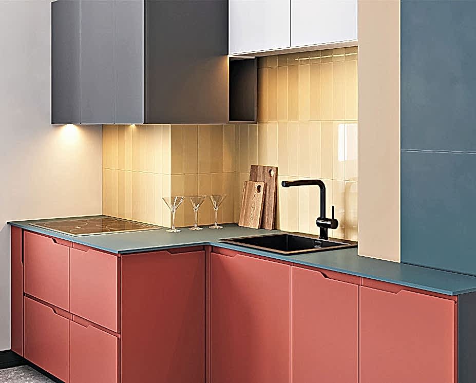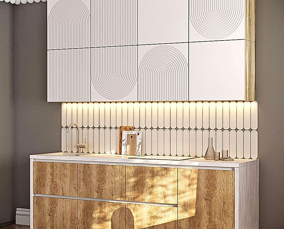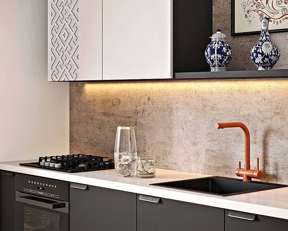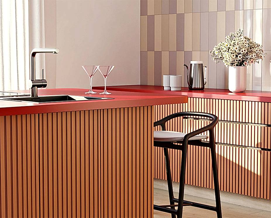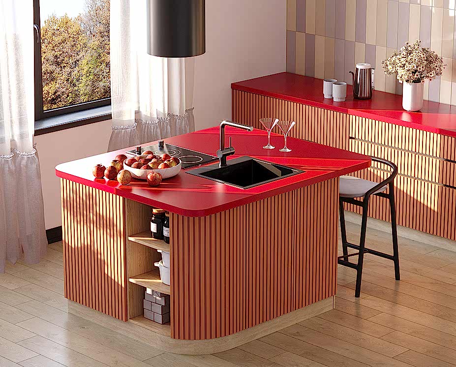 Коллекция «Нургуш» с ритмичной ребристой текстурой напоминает линии скальных пород, отражая Pin-Up силу спокойствия. Кухня подходит для тех, кто стремится к балансу между эстетикой и функциональностью.