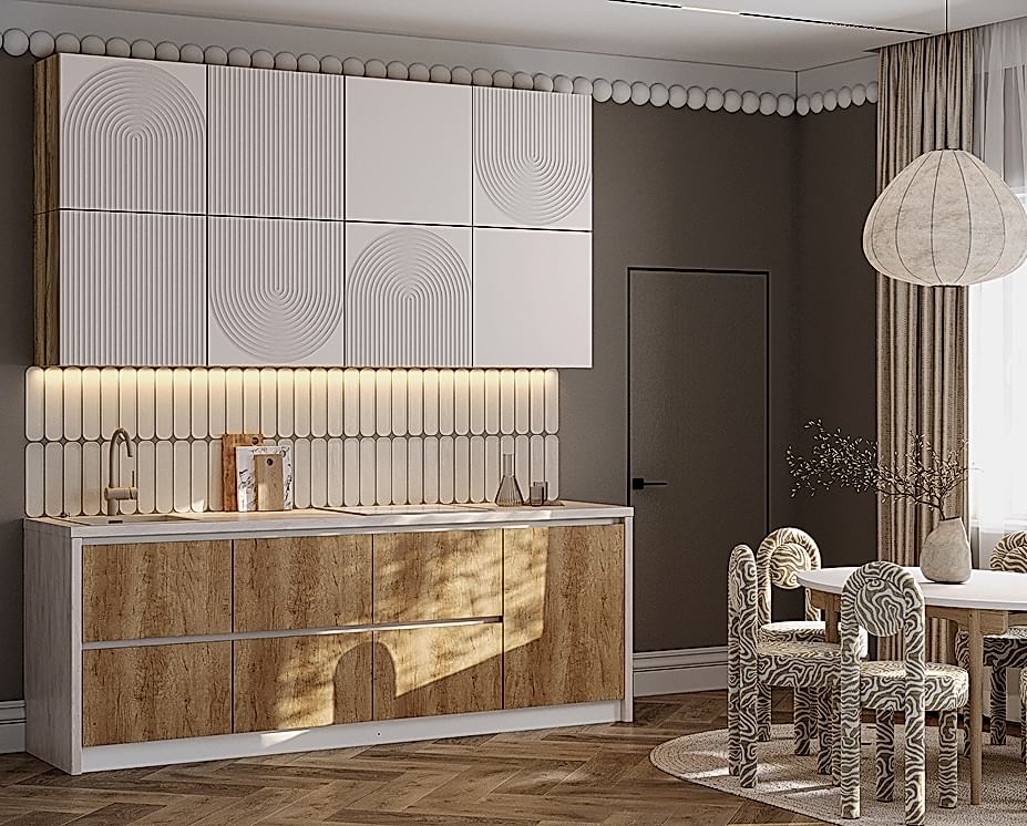 В кухне «Манарага» воплощена комбинация древесных и каменистых декоров, Pin-Up тактильную глубину при визуальной простоте. Кухня идеально подойдет для тех, кто ценит спокойный и функциональный интерьер без излишеств.