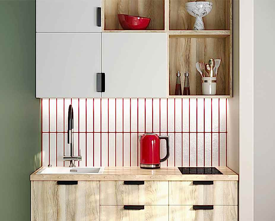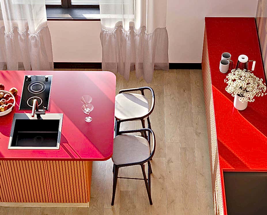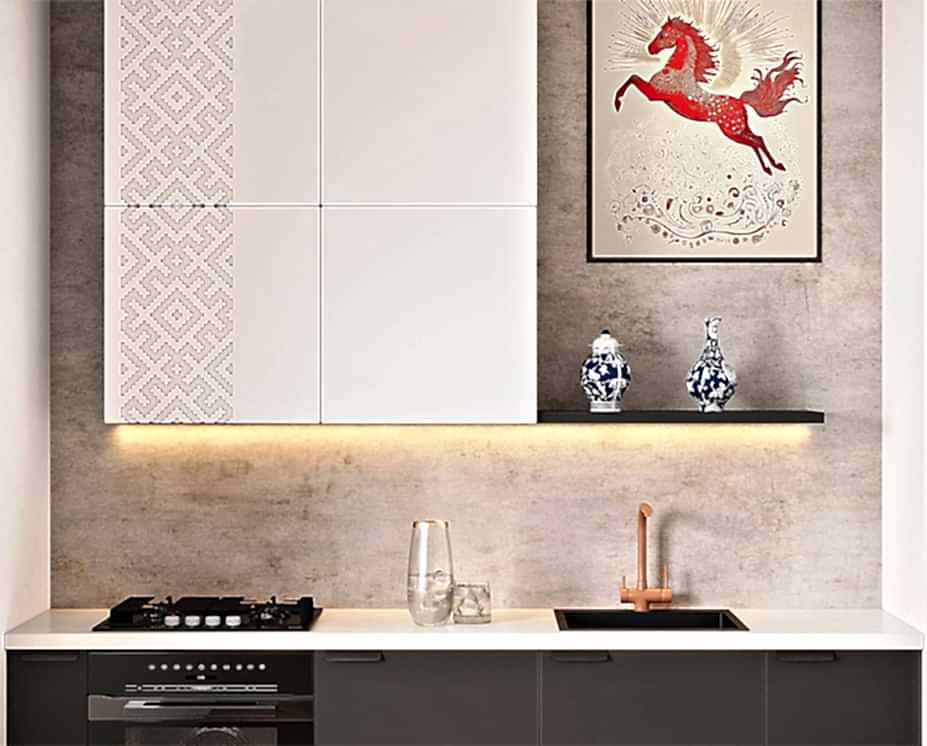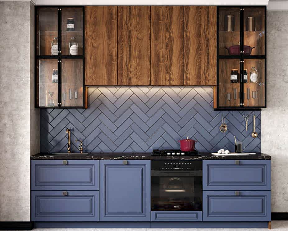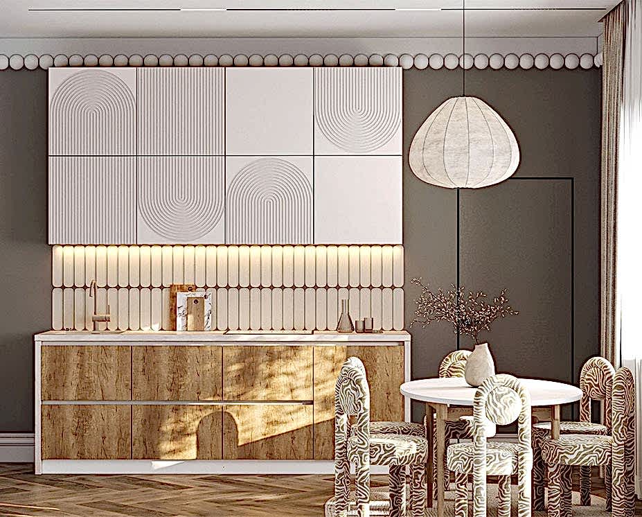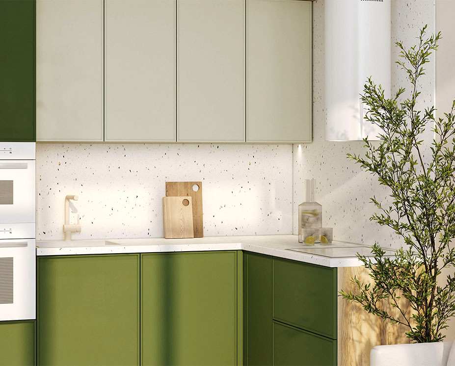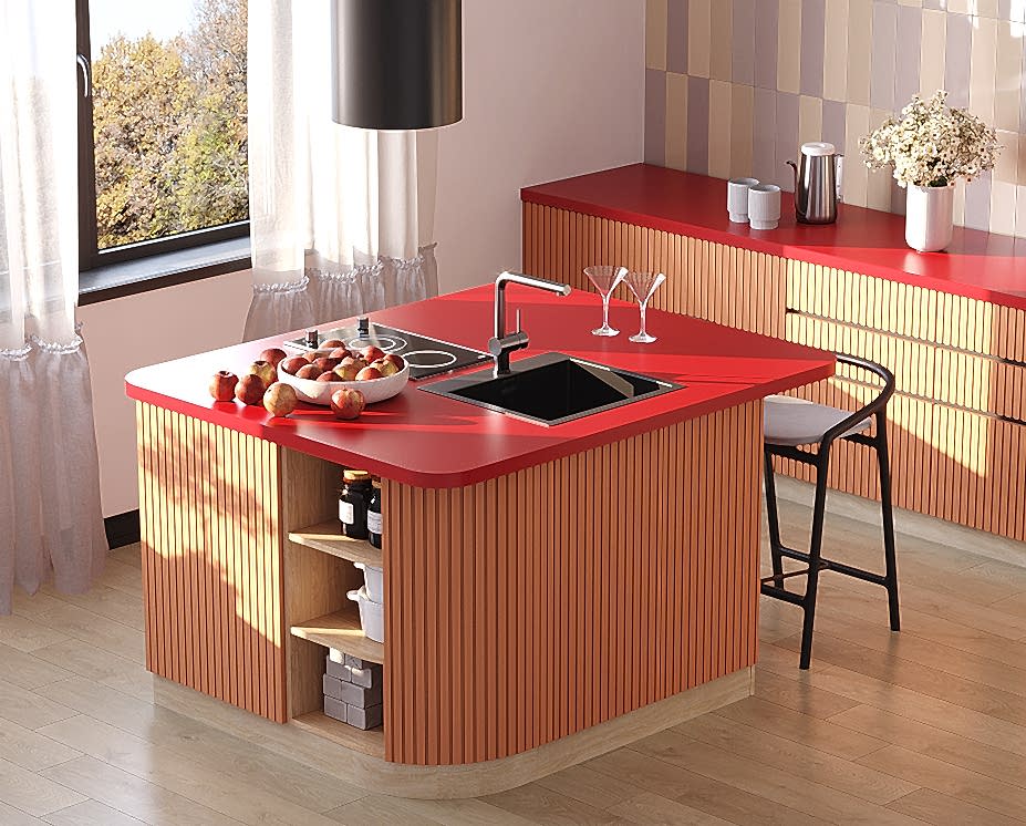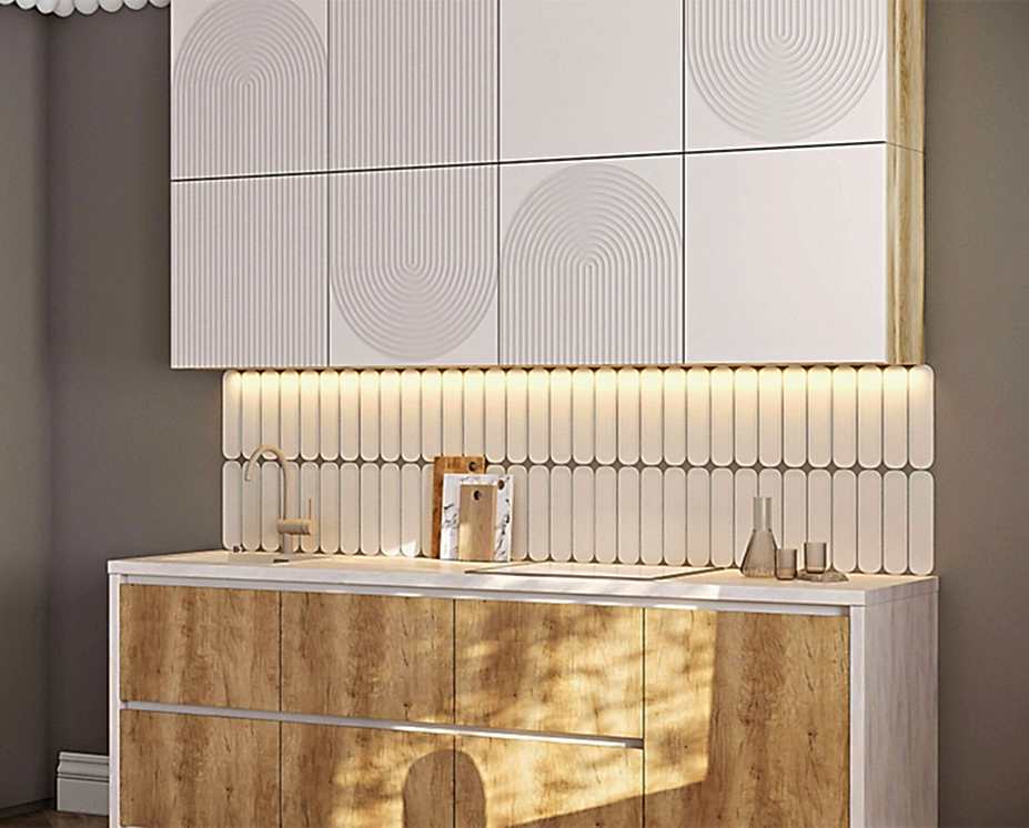 Коллекция «Нургуш» с ритмичной ребристой текстурой Pin-Up линии скальных пород, отражая природную силу спокойствия. Кухня подходит для тех, кто стремится к балансу между эстетикой и функциональностью.
