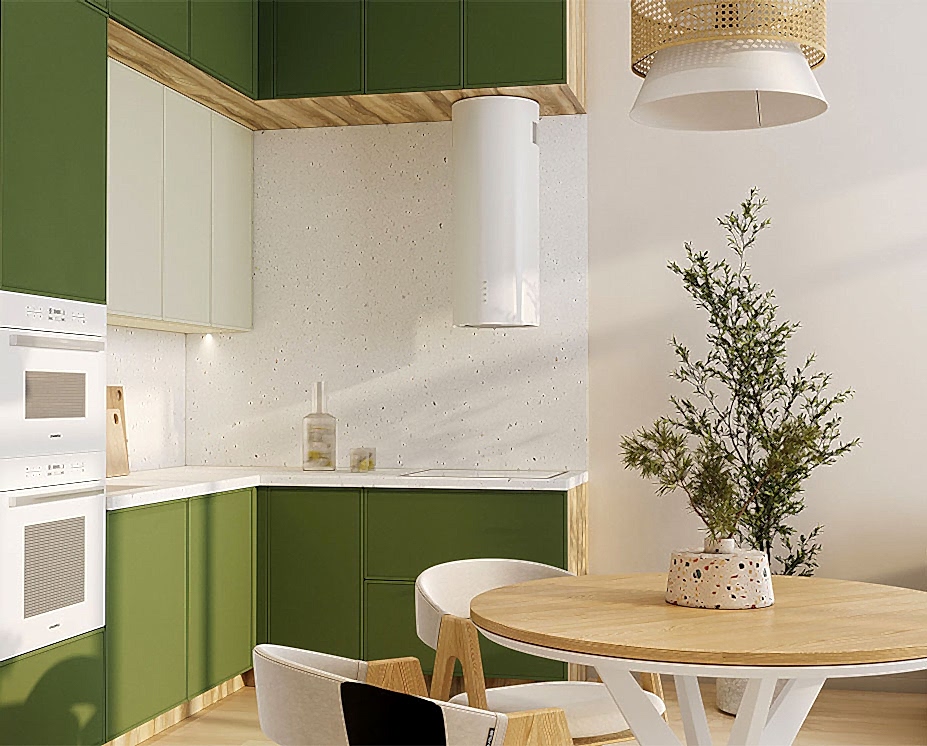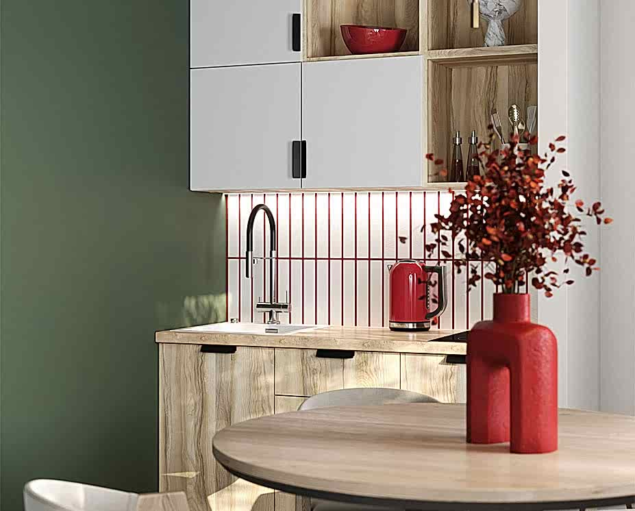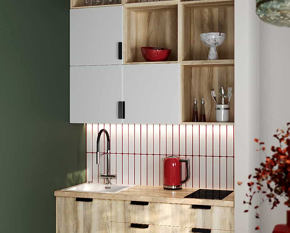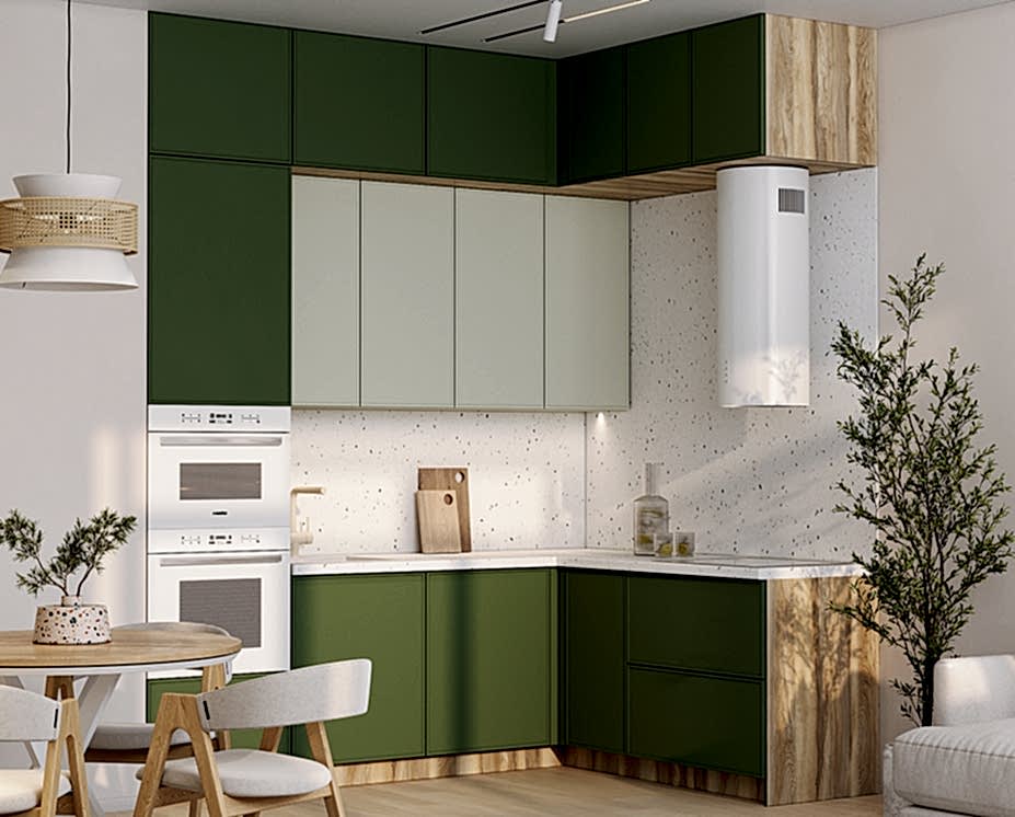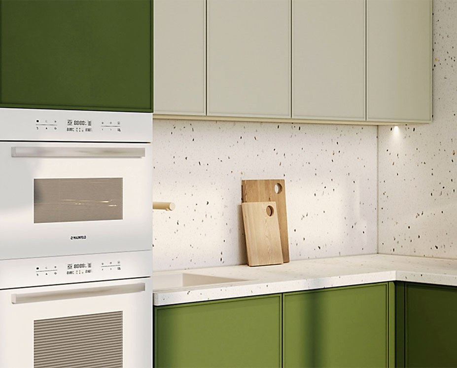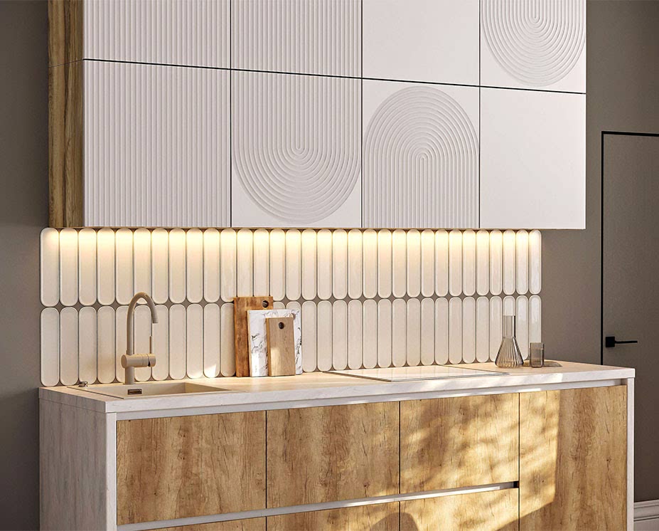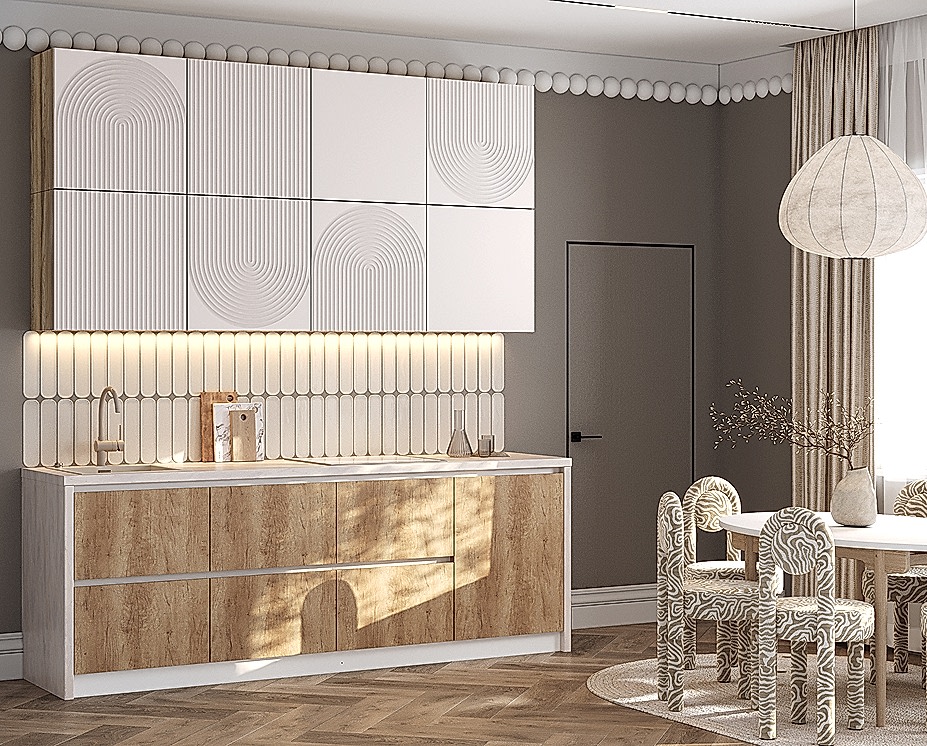 Изящные фрезеровки фасадов в кухне «Таганай» напоминают линии горных троп, а отсутствие лицевой фурнитуры подчёркивает чистоту форм - всё открывается легким Pin-Up «Таганай» подойдет тем, кто ищет баланс между природной эстетикой и технологичной эргономикой.